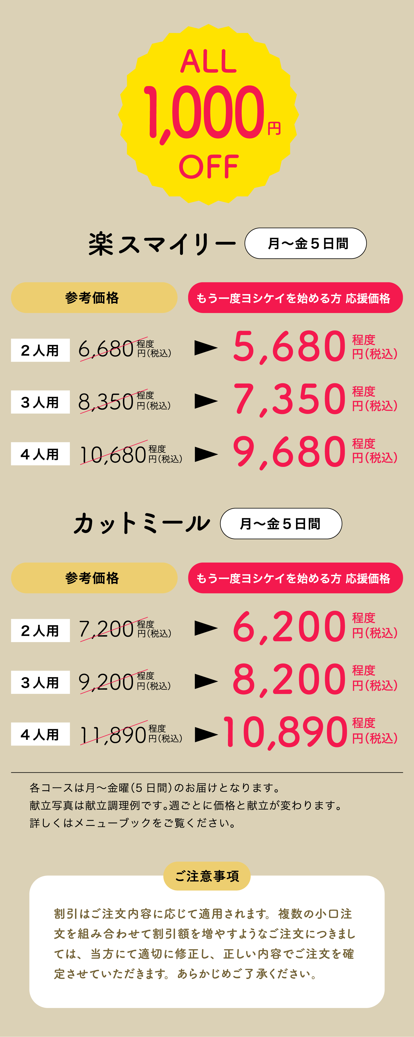 ご利用期間(5日間)の間、スマイルスタッフがご自宅まで毎日お届けいたします。ご利用後の継続義務は一切ございません。